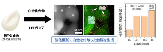 本研究の成果の一例として、酸化亜鉛を触媒化する基礎技術を開発しました。酸化亜鉛を含む日やけ止めに触媒の材料となる白金化合物を加え、LED光を照射することで、日やけ止め中の酸化亜鉛を触媒化することに成功しました。この触媒は通常の方法で生成した触媒と比べても遜色ないレベルで有害ガスである一酸化炭素を分解できることを確認しました(図3)。