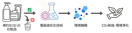 着目したのは日やけ止めなどに広く用いられている酸化亜鉛などの金属酸化物です。例えば、酸化亜鉛は日やけ止めには紫外線防御成分として配合される一方で、環境浄化や、二酸化炭素(CO2)からメタノールなどのエネルギー資源を生成する反応をはじめ、さまざまな化学反応を促進する触媒材料として産業的に重要な役割を担っています。一方で同成分は輸入依存度の高さやリサイクル率の低さなど、その運用には継続的な検討が求められています。そこで本研究では、東京大学 大学院工学系研究科 化学システム工学専攻 高鍋・小畑・岸本研究室が有する電磁波による化学反応を活用した独自技術を軸に、使われなくなった化粧品に含まれる金属酸化物を、新たな機能を持つ触媒として再生するプロセスの開発を進めています(図2)。なお、本研究はNEDOが実施する「官民による若手研究者発掘支援事業」における、共同研究フェーズに採択されています。