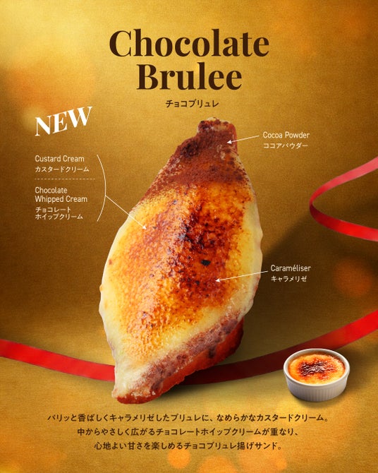 もう一つの新作は、パリッと香ばしくキャラメリゼしたブリュレに、なめらかなカスタードクリーム。中からやさしく広がるチョコレートホイップクリームが重なり、“割る・すくう・とろける”