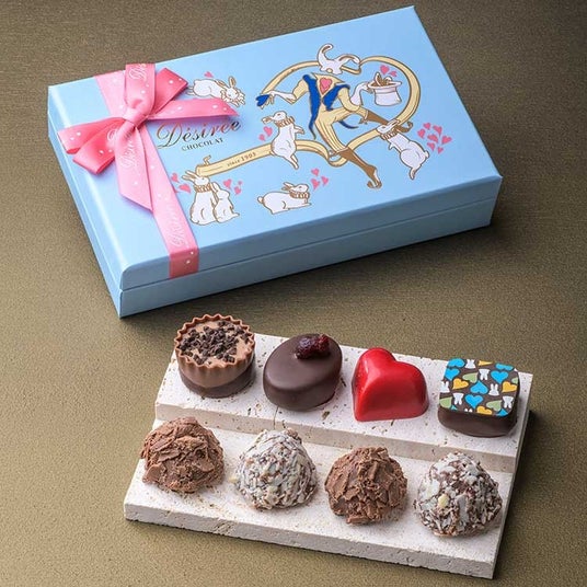 伝統の「トリュフ」2粒と新作トリュフ「スノーフレーク」、日本オリジナルテイストの「レッドハート」など、“ウサギのテーマパーク”をイメージした心弾むボックスに詰め合わせました。