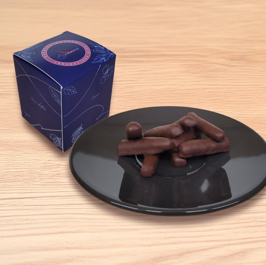 ダークチョコレートでコーティングした砂糖漬けオレンジピールのラグジュアリー・オランジェット。町田店開店50周年を記念した限定パッケージです。