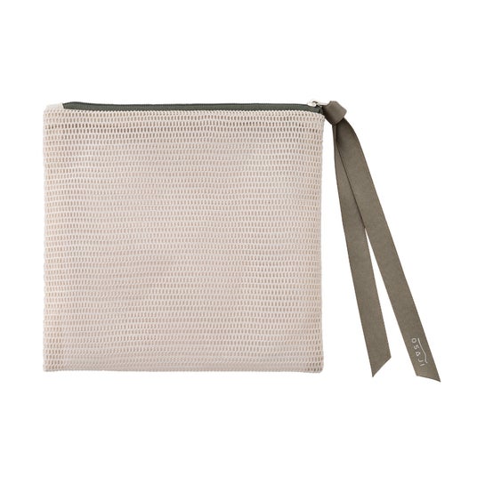 ・スクエアメッシュポーチ軽やかな透け感のあるメッシュ素材を使用したポーチに、OSAJIロゴをあしらったリボンを添えたポーチ。