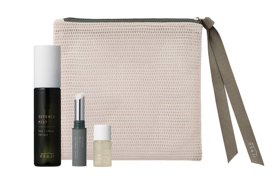 花粉や大気汚染物質から肌を守るディフェンスミスト・ディフェンスバームに、オリジナルメッシュポーチとOSAJIのベストセラー美容液を組み合わせた限定セットをご用意。