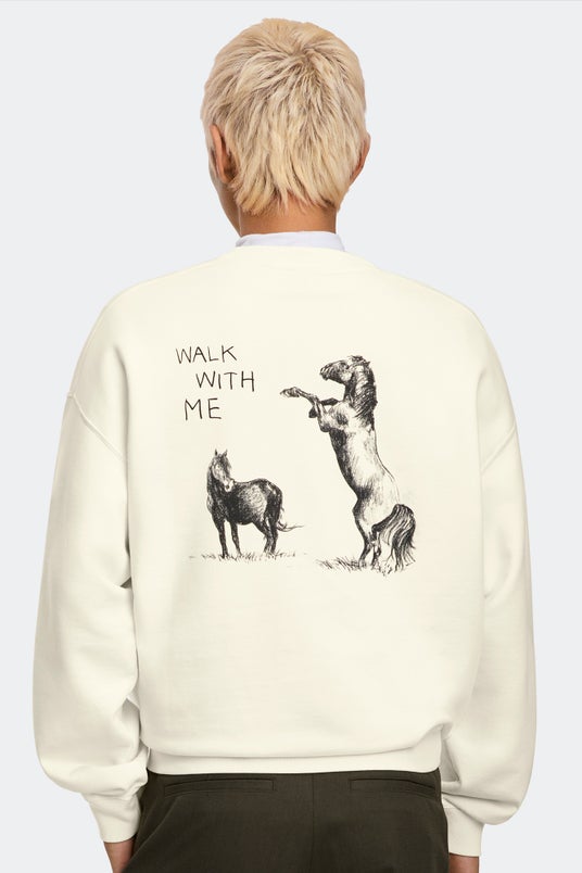 自然や野生馬を想起させるモチーフをさりげなく取り入れた彼の表現は、洗練されたビジュアルアプローチによって、ルナニューイヤーコレクションに文化的かつ芸術的な奥行きをもたらします。馬のフォルムやラインから着想を得たグラフィックは、ミニマルな構成の中に祝祭的な意味を宿し、コレクション全体のファッションストーリーと有機的に響き合います。
