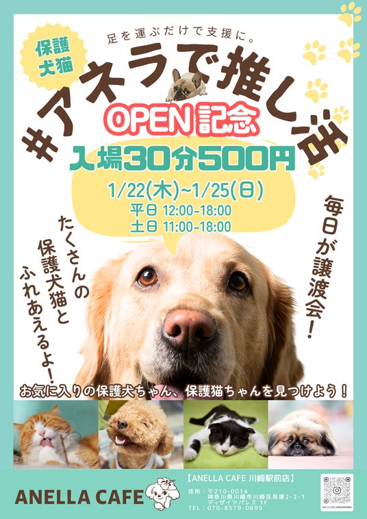 福祉型保護犬猫ふれあいカフェ「ANELLA CAFE -アネラカフェ- 」を全国に展開する株式会社ANELLA Group(本社:東京都世田谷区、代表取締役:伊東大輝)は、神奈川県内で3店舗目となる「ANELLA CAFE 川崎駅前店」を、2026年1月22日(木)12時にオープンいたします。