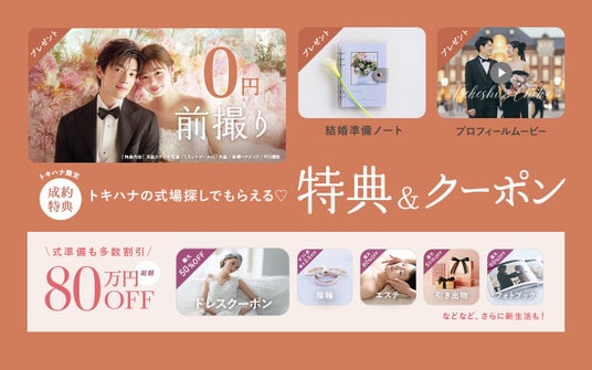 LINEでできる式場探し『トキハナ(https://tokihana.net/)』を運営する株式会社トキハナ(本社:東京都港区、代表取締役社長:安藤 正樹、以下「トキハナ」)は、トキハナ経由で結婚式場を成約された方全員を対象に、人気フォトスタジオでの前撮り撮影の基本料をプレゼントする特典の提供を開始しました。
