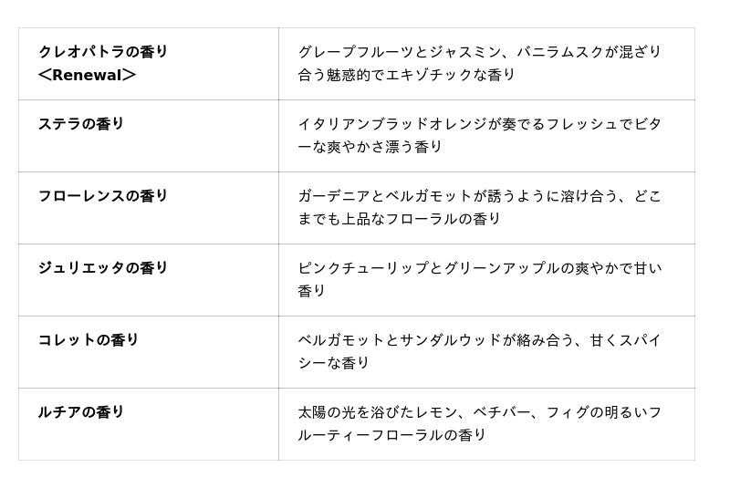 今回のリニューアルでは「クレオパトラの香り」の香調をファインフレグランスにあわせてアップデート。そして、「コレットの香り」と「ルチアの香り」が新たに加わり、全6種の香り展開となります。