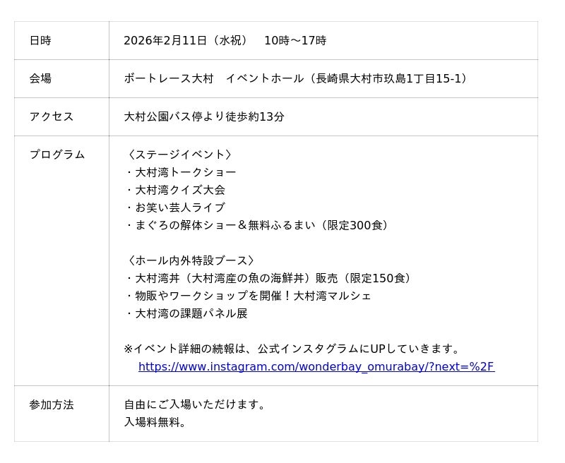 一般社団法人大村湾ワンダーベイは、大村湾流域5市5町の企業・自治体・地域住民のひとりひとりが、大村湾の課題解決に向けて「ワンチームで今取組むべきこと」を知り、意識変容やアクションを起こすことを目的に、2026年2月11日(月祝)に「大村湾にぎわいまつり」を開催いたします。大村湾ワンダーベイプロジェクトは、地元大村湾を身近に感じ、海の環境について考えるきっかけを創出していきます。