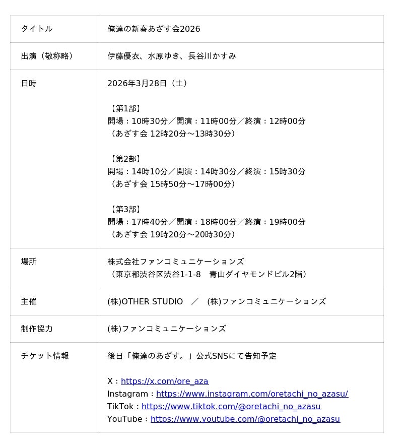 プロシューマー支援事業を展開する株式会社ファンコミュニケーションズ(本社:東京都渋谷区、代表取締役社長:二宮幸司 東京証券取引所プライム市場:2461)はSNSショートドラマ「俺達のあざす。」の世界観をリアルに体験できるイベント『俺達の新春あざす会2026』を株式会社OTHER STUDIOと共に2026年3月28日(土)に開催いたします。