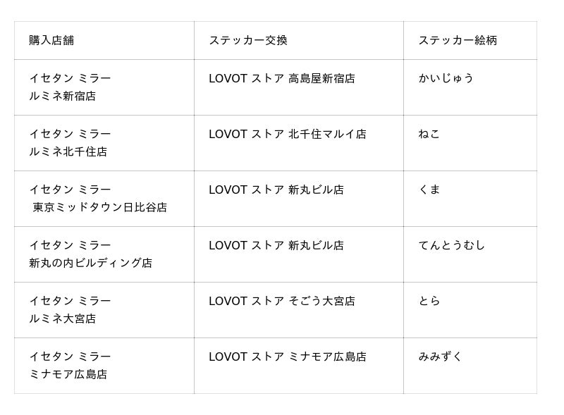 さらに、対象のイセタン ミラー店舗にて税込3,300円以上お買い上げいただいたレシートを、指定のLOVOTストアへお持ちいただいた方に、特製ステッカーをプレゼントいたします。ステッカーはイセタン ミラー店舗ごとに異なり、店頭に登場する『LOVOT』を描いたオリジナルデザインです。