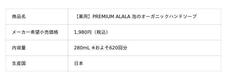 岩谷産業株式会社(本社:大阪・東京、社長:間島寬、資本金:350億円)は、家庭用洗剤ブランド「ALALA(アララ)」シリーズの新商品で、天然精油の香りとうるおい成分が手洗い時間を贅沢に彩る「【薬用】PREMIUM ALALA 泡のオーガニックハンドソープ」を、全国のバラエティショップ、専門店、当社公式オンラインショップ「イワタニアイコレクト」、当社直営ショップ「Iwatani Outdoor Shop BASE」等で1月26日より順次発売開始します。