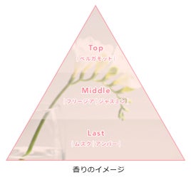 「ベルガモット精油」と「ジャスミン精油」の2種の天然精油(※6)を配合。可憐なフリージアに、パウダリーなムスクとジャスミンがやさしい余韻を残す、みずみずしく透明感のある香りです。