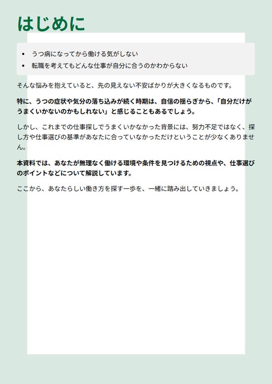 本資料では、うつ病による働きづらさの背景や、ミスマッチを防ぐ仕事選びの考え方、安心して続けられる条件の整理方法などについて解説しています。