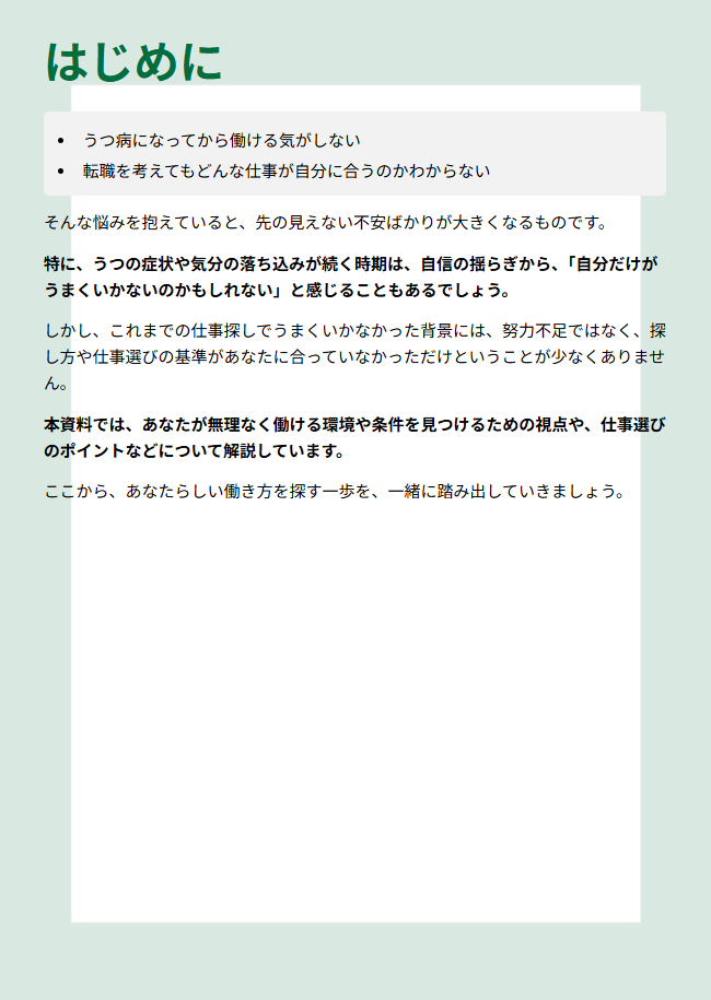 本資料では、うつ病と向き合いながら仕事を選ぶための考え方や、無理なく働ける条件の整理方法についてわかりやすく解説しています。