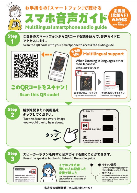 スマホとイヤホンで学芸員監修の解説が聴ける音声ガイド(50言語・無料)。「自分のペースで聞けるのがいい」「初心者でも理解できた」と好評。企画展「いろんな刀大集合」(~3/15)で。