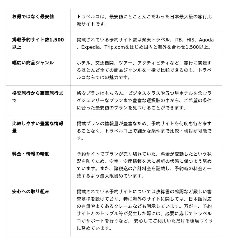 トラベルコは、これまでもこれからも「最も安く・最も便利で・最も親切に」をモットーに、皆さまの快適な旅を全力でサポートしてまいります。