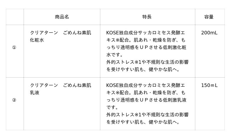コーセーコスメポート株式会社(本社:東京都中央区、代表取締役社長:小林 孝雄)は、スキンケアブランド『クリアターン』の「ごめんね素肌」シリーズから、化粧水・乳液(1品目2品種、ノープリントプライス)を2026年2月20日より全国の量販店・ドラッグストアを中心に順次発売します。