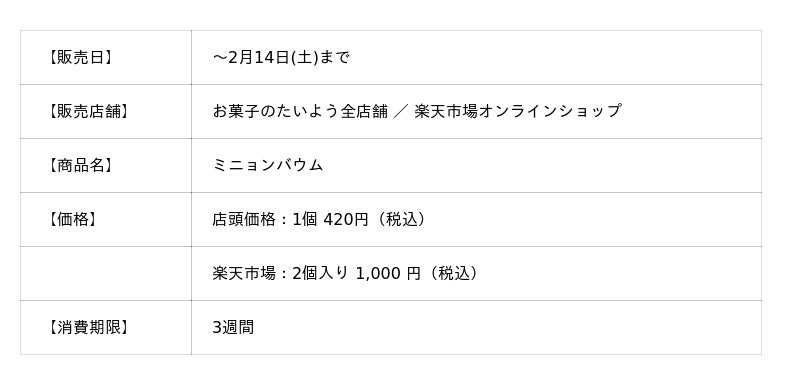 株式会社太陽社(所在地:千葉県匝瑳市飯倉293、代表取締役:片岡正裕)が展開する、千葉県で長年愛され続ける菓子店「お菓子のたいよう」は、バレンタインスイーツ第一弾となる、バレンタイン限定の看板商品「ミニョンバウム」を今年も1月30日(金)より販売いたします。今年は新デザインにピスタチオが加わり、可愛さをアップデート。さらに、待望のオンラインショップ対応も開始。店舗でしか買えなかった本商品が、全国どこからでもお楽しみいただけるようになります。