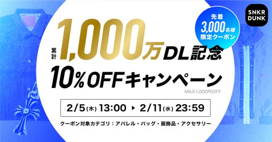 期間中にクーポンを取得すると、先着3,000名様が、アパレル・バッグ・服飾品・アクセサリーに使える「1,000万ダウンロード記念10%OFFクーポン」をご利用いただけます。