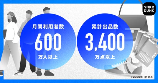 2019年4月に公式アプリの提供を開始したスニダンは、スニーカーやアパレルを中心とするファッション領域やトレーディングカード・フィギュアなどを中心に、個人間での売買を簡単に行えるファッション・コレクティブルフリマアプリです。月間利用者数は600万人以上、累計出品数は3,400万点(※1)を突破し、多くのお客さまにご支持いただいております。