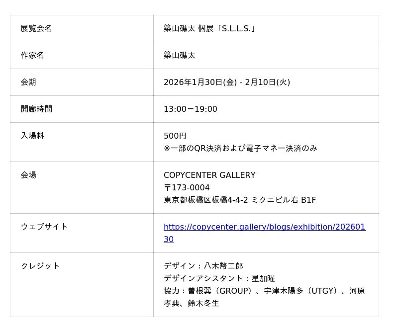 アートギャラリー「COPYCENTER GALLERY」(東京・板橋)は、2026年1月30日(金)から2月10日(火)まで、築山礁太による個展「S.L.L.S.」を開催します。本展は築山にとって4年ぶりの個展となり、写真を像として提示する以前の段階に着目し、観測のプロセスそのものを空間として提示するインスタレーションを展開します。