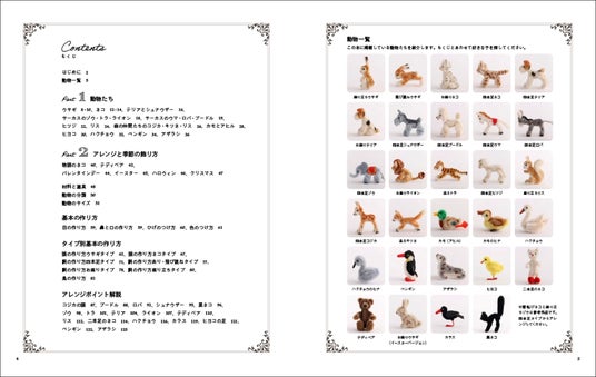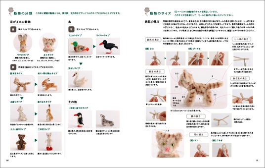 「基本の作り方」から「アレンジ作品」まで、すべての工程を写真で解説しており、制作の基本となる形をもとに、耳や足、しっぽなどのアレンジを加えることで、さまざまな動物が作れます。