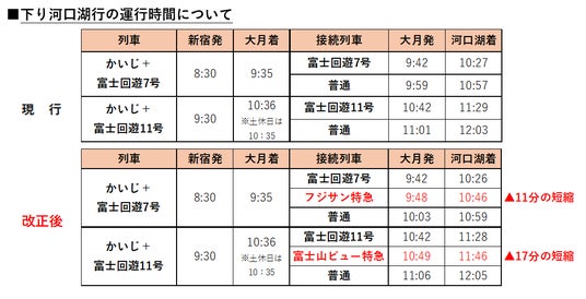 また、夕方から夜の時間帯における上り列車を増発するとともに、新宿方面からのJR中央線特急「あずさ・かいじ」との待ち時間を改善し、通勤・通学でのご利用や東京方面からのお帰り時における利便性を向上させます。渋滞の心配がない鉄道利用により、首都圏から富士五湖エリアへの観光はもちろん、東京方面へも安心してお出かけいただけます。