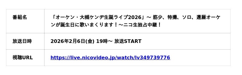 「オーケン・大槻ケンヂ生誕ライブ2026」~ 筋少、特撮、ソロ、還暦オーケンが誕生日に歌いまくります!~ニコ生独占中継!