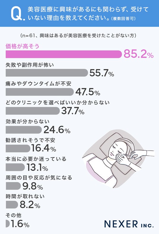 最も多かったのは「価格が高そう」で、85.2%の方が選択しました。次いで「失敗や副作用が怖い」で55.7%、「痛みやダウンタイムが不安」で47.5%となっています。