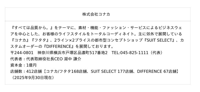 誰でも気軽に楽しめる、シンプル、イージー、フレンドリーなオーダースーツの未来形をいち早く実現した新ブランド。KONAKAがこれまで培ってきた高品質なスーツづくりのノウハウをベースに、コストパフォーマンスに優れた商品性、ビジネスカジュアルスタイルなど最新トレンドを取り込んだラインアップ、効率重視のスマートな購入プロセスといったオーダースーツに求められる新しいニーズに素早く対応しています。