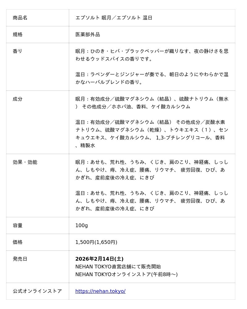馬居化成工業株式会社(本社:徳島県鳴門市、代表取締役:馬居正治)が運営する〈NEHAN TOKYO〉は、医薬部外品の薬用バスソルト「エプソルト 眠月(みんげつ)」「エプソルト 温日(おんじつ)」の2種を、2026年2月14日(土)に発売いたします。