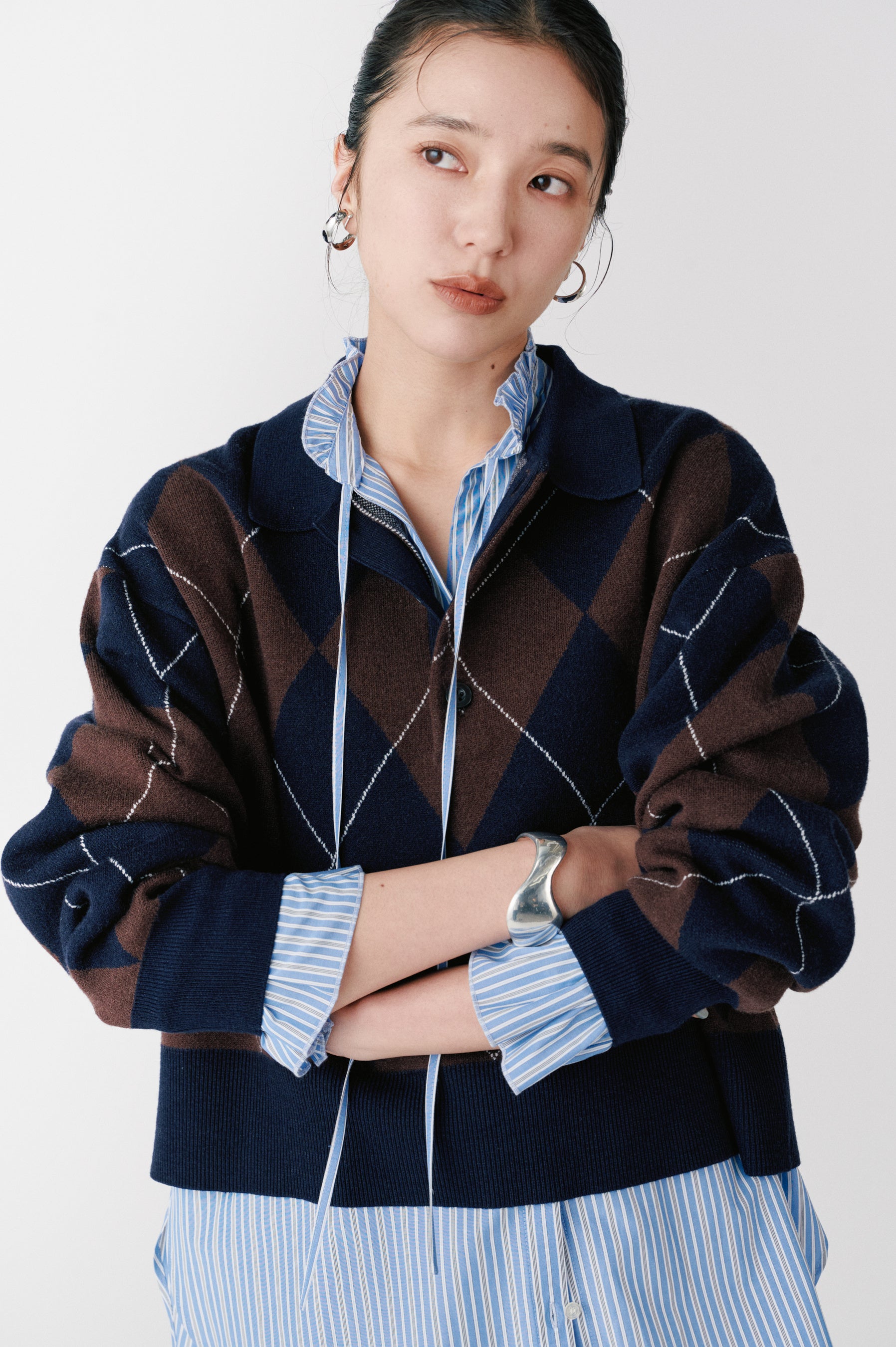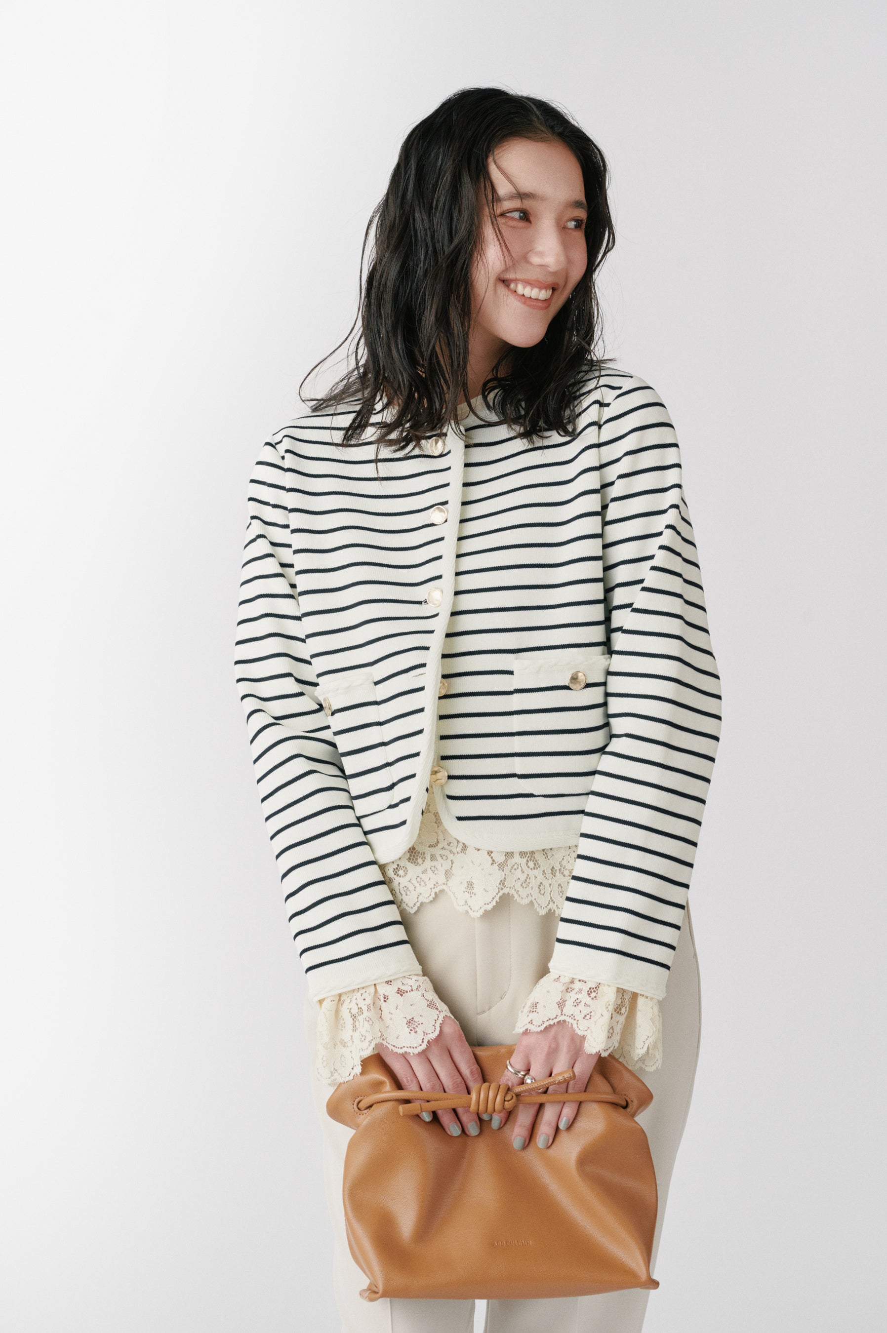 ¥14,300 ta xinクラシカルで洗練された、金ボタンがポイントのきれいめニットジャケット。ニットカーディガンよりもきちんと見える、絶妙なバランス◎。全体の端やポケット口には、共糸で柄編みしたトリミングを施し、さりげない立体感とクラフト感をプラス。軽やかな着心地ながら、羽織るだけでスタイリングが整う着まわし万能アイテムです。
