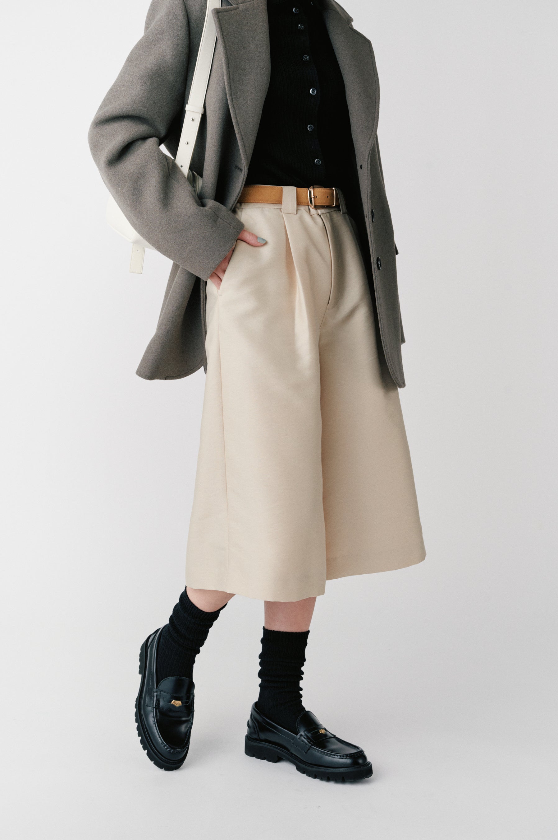 ¥14,630 tax inキュロット丈とややロー気味なウエストラインのバランスが、今季らしいシルエットを演出するキュロットパンツ。タックを取りボリュームのある分量にしつつ、エアリーな素材感で軽やかなスタイリングにまとまる一着。