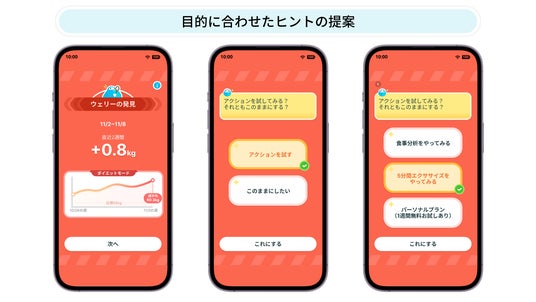本機能は、毎週末に体重変化の振り返りと、目的に応じた生活のヒントを提案するものです。累計10万人以上のユーザー利用データから導き出されたインサイトを元に開発され、日々の細かな数値の変化から中長期的な「変化の傾向」に目を向けることで、数字への一喜一憂やストレスを解消し、ユーザーにとって無理のない行動変容と健康習慣の継続をサポートします。