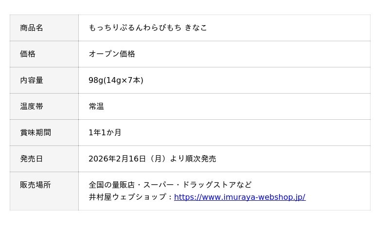 井村屋株式会社(本社:三重県津市高茶屋七丁目1番1号、社長:岩本 康)は、特許技術「ギュッと押すだけパッケージ」を採用した人気の和菓子「もっちりぷるんわらびもち」シリーズから、新フレーバーとして『もっちりぷるんわらびもち きなこ』を、2026年2月16日(月)より発売します。