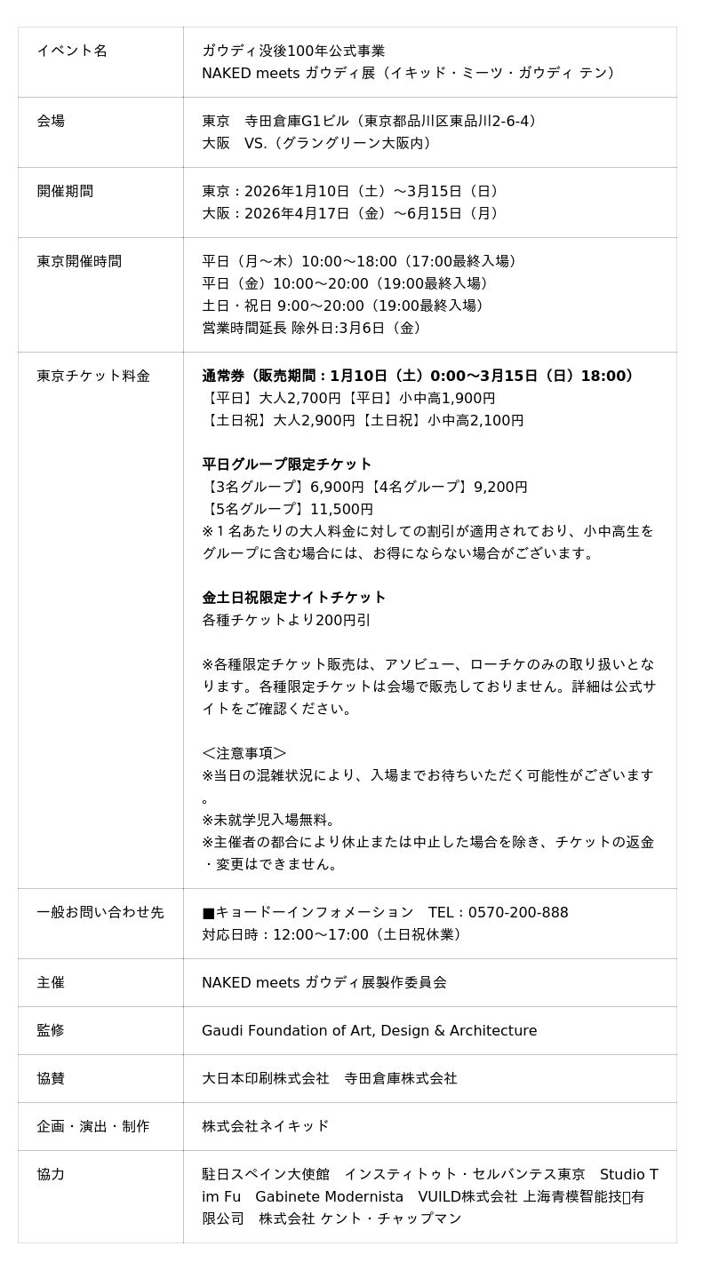 株式会社ネイキッド(英語表記:NAKED, INC./所在地:東京都渋谷区/代表:村松亮太郎)は、2026年1月10日(土)から3月15日(日)まで寺田倉庫G1ビルにて開催中の「ガウディ没後100年公式事業 NAKED meets ガウディ展」(主催:NAKED meets ガウディ展製作委員会)において、開幕の1月10日(土)~2月4日(水)までの26日間で会期1カ月を待たずして、累計来場者数5万人を達成したことをご報告いたします。