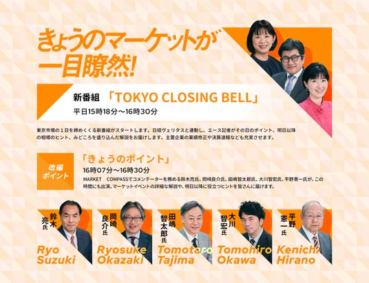 東京市場の1日を締めくくる新番組がスタートします。日経ヴェリタスと連動し、エース記者がその日のポイント、明日以降の相場のヒント、みどころを盛り込んだ解説をお届けします。主要企業の業績修正や決算速報なども充実させます。