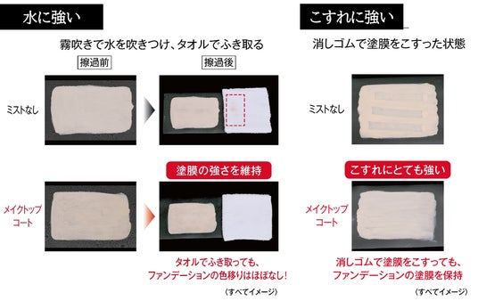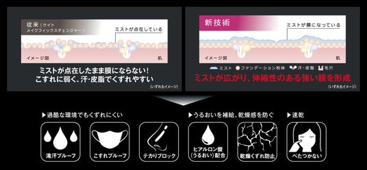 ミストがミクロレベルで隅々まで均一に伸び広がり、膜となり全体をカバー。汗・皮脂・こすれ・乾燥くずれからメイクを徹底ガード!