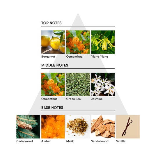 金木犀の穏やかな甘さに、グリーンティの清らかさが溶け合う香り。ベルガモットと金木犀の軽やかなトップから、グリーンティとジャスミンが透明感と静けさを重ね、イランイランがやさしく奥行きを添える。ラストはサンダルウッドとバニラが包み込むように広がり、温もりの余韻を残す。控えめでありながら記憶に残る、“静けさの中にある美しさ”をそっと映し出す香り。