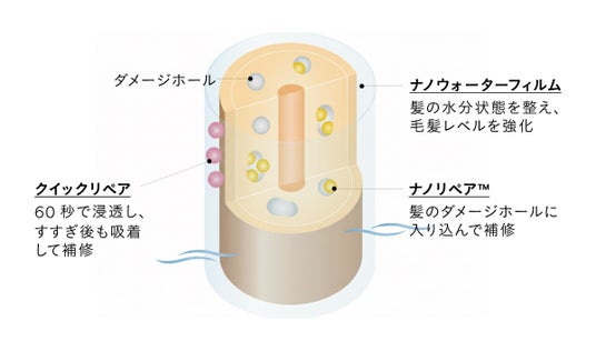 シャンプー&トリートメントメントとの共通成分3 種配合。髪内部のダメージホールをダイレクトに補修する成分「ナノリペア(TM)※2」とわずか60 秒で浸透し亀裂や表面のめくれをケアする「クイックリペア※3」、髪内部の水分バランスを整える「ナノウォーターフィルム※4」を配合。使うたび毛髪レベルを強化し、美しい素髪へ導く。