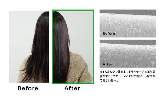 タオルドライ後、適量のオイルミルクを髪全体に均一になじませます。