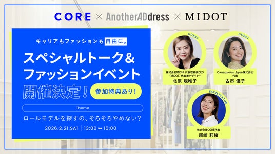 株式会社MICHI(本社:東京都港区、代表取締役:北原 規稚子)が展開するドットをモチーフにしたキャリア女性の日常に寄り添うアパレルブランド「MIDOT」は、女性が活躍し続けられる社会をつくることをビジョンに活動しているCORE株式会社、大丸松坂屋百貨店が運営するファッションサブスクリプションサービス 「AnotherADdress」の2社と合同で、2026年2月21日(土)にスペシャルトーク&ファッションイベントを開催いたします。