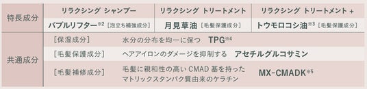 – 扱いにくい「くせ・うねり毛」に根元からアプローチし、「髪の凝り」をほぐして髪をやわらかくすることで、スタイリングしやすい髪へ導くために「フリッズリラクサー*¹」を共通成分として配合しました。シャンプーとトリートメントに配合することで、根元から扱いやすい髪へ導きます。
