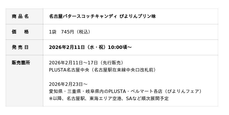 株式会社ノースマート(本社:北海道石狩市 代表取締役社長:綱島広和)が展開する北海道ブランド「森のkigiバタースコッチ」から2026年2月11日にシリーズ初となる「名古屋バタースコッチキャンディ ぴよりんプリン味」を発売。ジェイアール東海フードサービス株式会社のオリジナルスイーツ