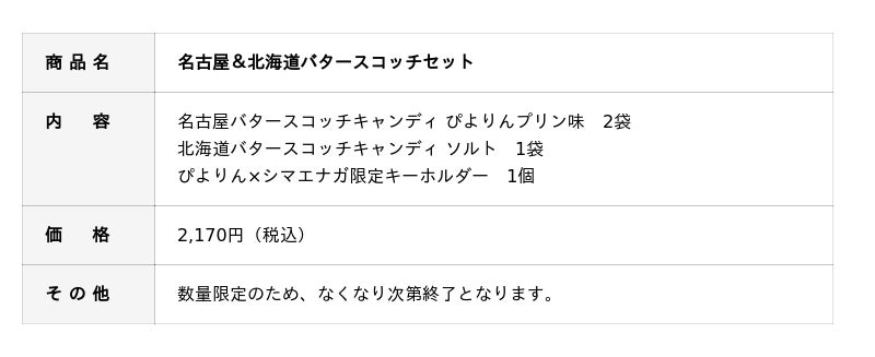 催事期間中、ぴよりんとシマエナガの初コラボキーホルダーが付いてくるセット商品や、北海道で大人気の北海道バタースコッチ4種も一緒にお買い求めいただけます。