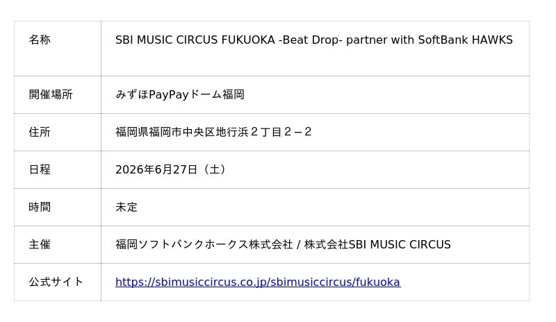 株式会社SBI MUSIC CIRCUS、(本社:東京都港区、代表取締役社長:大付 楽洋、以下「当社」)は、福岡ソフトバンクホークス株式会社(本社:福岡市中央区、代表取締役社長CEO:後藤 芳光)と共催で、2026年6月27日(土)に、みずほPayPayドーム福岡で第7回目の「SBI MUSIC CIRCUS FUKUOKA -Beat Drop- partner with SoftBank HAWKS」を開催することとなりましたので、お知らせいたします。
