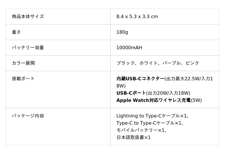 ケーブルレス革命USB-C端子一体型設計(出力最大22.5W/入力18W)。