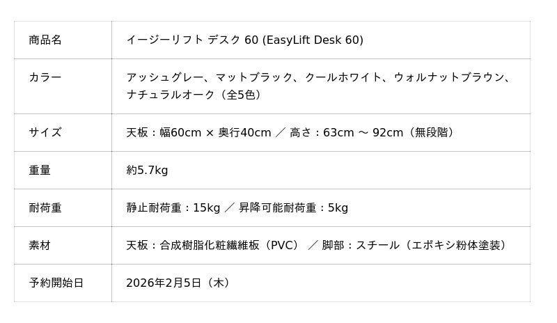 Fun Standard株式会社(本社:福岡県大野城市、代表取締役:大屋 良介・笹森 広貴)が展開するスポーツ・アウトドアブランド「PYKES PEAK(パイクスピーク)」は、2026年2月5日(木)より、レバー式昇降システムと折りたたみ機能を搭載したサイドテーブル『イージーリフト デスク 60(EasyLift Desk 60)』の予約販売を開始いたします。また、本製品の発売を記念して、予約期間中にご使用いただける「1,000円OFFクーポン」を配布いたします。