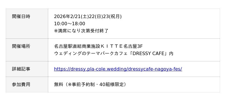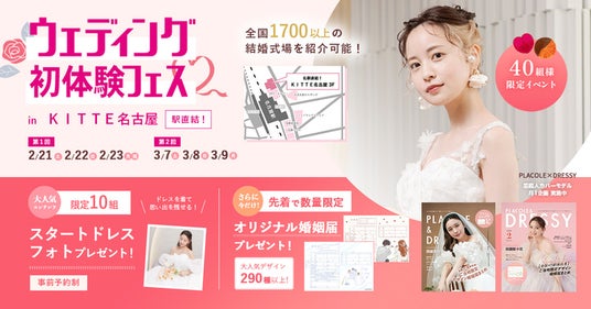 「PLACOLE & DRESSY」ブランドを展開する、冒険社プラコレ(本社:神奈川県鎌倉市、代表取締役CEO:武藤功樹)は、名古屋駅直結商業施設KITTE名古屋3F、ウェディングのテーマパークカフェ”DRESSY CAFE”にて、2/21(土)22(日)23(祝月)の3日間限定で、これから結婚式をお考えのカップル様に向けた、個室相談やウェディングドレス試着ができる豪華特典付きのウェディング初体験フェスを開催いたします。(40組様限定、無料開催)
