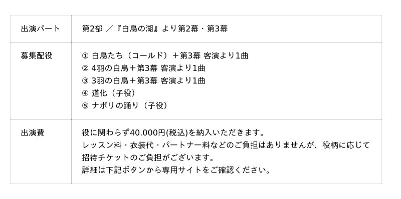 バレエアンサンブルガラ公演へ出演する「未来のプロダンサー」の募集がスタートしました。本公演では《「白鳥の湖」より第2幕・第3幕》に出演する「共演ダンサー」を広く募集いたします!